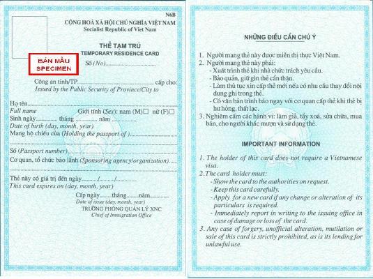 • 01 written request for TRC (form N7A), declaration of information on foreigners applying for TRC (form N7B) with photos (attached 02 photos sized 3×4 cm).